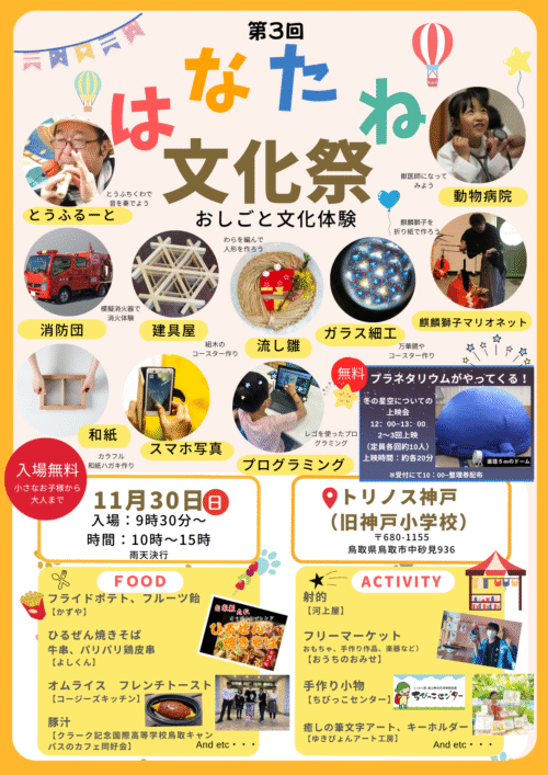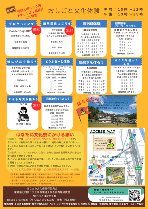 | 9:30 | はなたね文化祭入場(キッチンカー・屋台・アクティビティ等営業開始)おしごと文化体験:午前体験分チケット販売と整理券配布 |